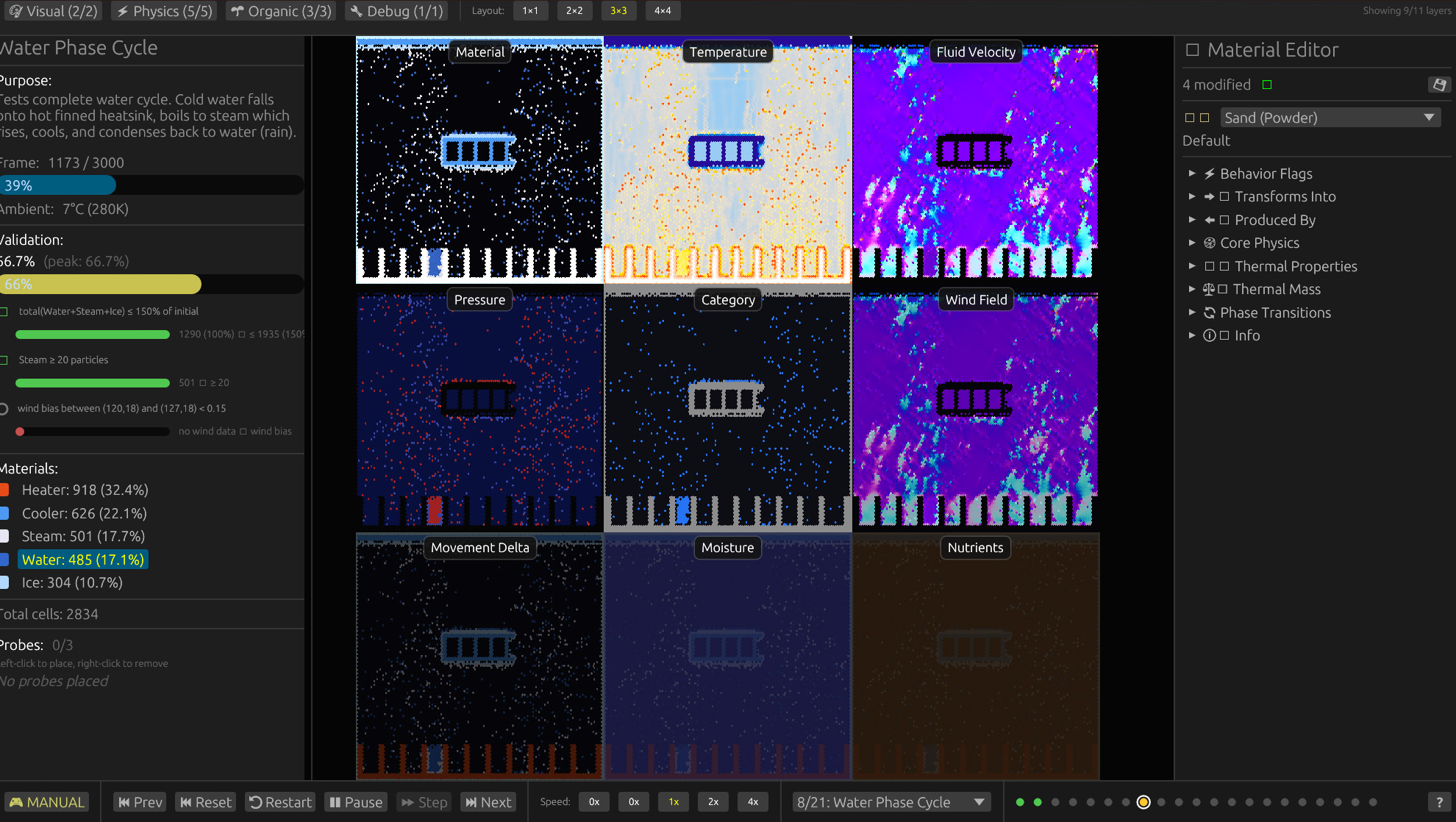 Metalrain GPU Tests is an interactive visualization of a GPU-accelerated falling sand simulation engine. Watch 20+ physics scenarios run in real-time, testing everything from basic particle physics to complex ecosystems.